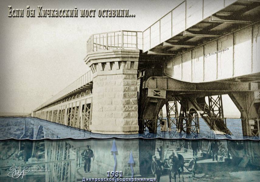 При создании Днепровского водохранилища мост затапливался по нижний ярус и терял сообщение с правым берегом. Если бы его оставили, картина была бы приблизительно такой... vvvvvvvvvvvvv коллаж: Artem Borodin