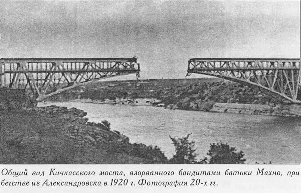 С началом гражданской войны Кичкаский железнодорожный мост приобретает стратегическое значение. По нему перевозятся войска и боеприпасы, раненые и медикаменты, различная техника. Полотно моста несколько раз взрывали отходившие на правобережье под натиском Красной Армии белогвардейцы и всевозможные банды. Однако самое серьезное разрушение было нанесено махновцами при их отступлении из Алесандровска в 1920 г.